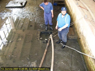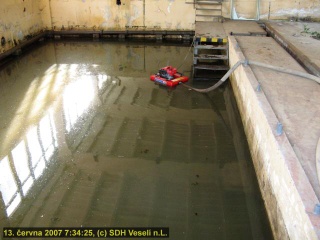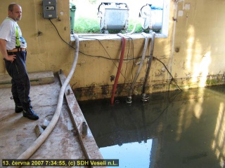 Na žádost jednatele Veselských služeb sro. pana Bendy Jaroslava vyjela naše jednotka odčerpat vodu z bývalé výměníkové stanice na Blatském sídlišti. Voda do výměníkové stanice vnikla po přívalovém dešti v pondělí 11.6.2007. Naše jednotka nasadila k odčerpání vody 3 ks elektrických kalových čerpadel napojených na elektrocentrálu Honda a plovoucí čerpadlo Niagara. Voda byla odčerpávána z plochy cca 90 m2, kde byla hloubka vody asi 80 cm. Odčerpaná voda musela být vypouštěna na vozovku, protože jímka ve výměníku je propojena s okolní kanalizací. Voda se také stahovala ze zatopeného teplovodního kanálu pro Blatské sídliště. Po vyčerpání vody z prostoru se naše jednotka vrátila na základnu.