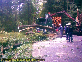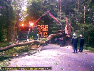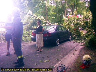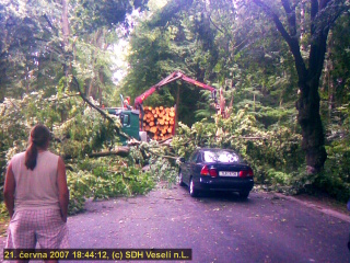 Přes tři hodiny byla ve čtvrtek 21.6.07 odpoledne zablokována silnice Veselí – Třeboň kousek za hrází Horusického rybníka. Nápor větru nevydržela stará lípa a spadla těsně před projíždějící automobil.
