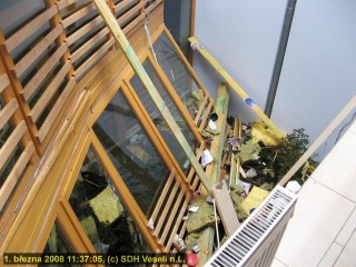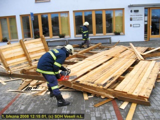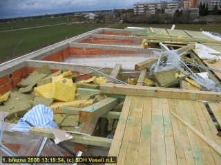 První družstvo naší jednotky bylo povoláno na Dům sv.Františka K Zastávce 646 ve Veselí nad Lužnicí. Průzkumem bylo zjištěno, že vichřice utrhla část střechy i s krovem, včetně podhledů v pokojích ve 3. nadzemním podlaží. Jedna část krovu spadla na parkoviště, kde poškodila několik zaparkovaných automobilů a druhá část zůstala na střeše. Družstvo pomohlo Záchranné službě při přepravě zraněných. Dále odstranilo část krovu na střeše a na parkovišti. Potom vyneslo osobní věci obyvatel z šesti pokojů,  kde nebyl sádrokartonový strop a ani okna. Dále pomáhalo při evakuaci obyvatel z postiženého křídla domu a provizorně zajistilo okna ve 2. nadzemním podlaží, která byla vytržena z kování.